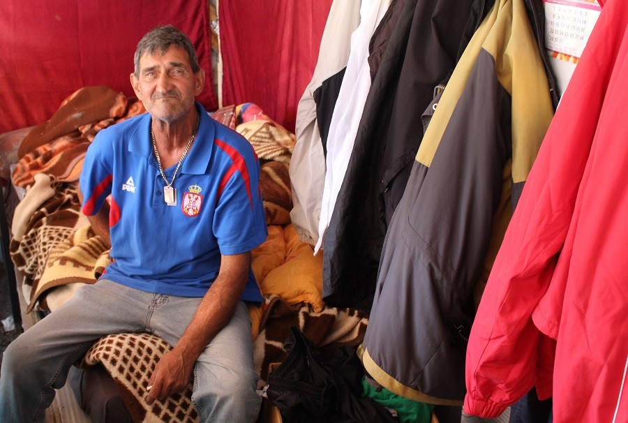 On danju prodaje robu, dočekuje i ispraća kupce, većinom inostrane putnike u prolazu, a noću spava ispod štanda koji je, izuzme li se stara laminačka škola gdje su ga opština i država privremeno smjestili prije nekoliko godina, njegova jedina adresa.