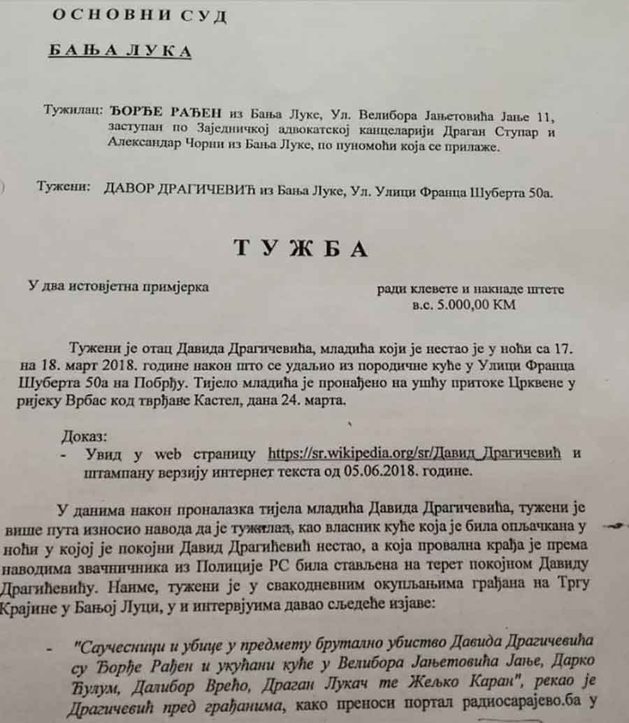 Đorđe Rađen podnio je tužbu protiv Davora Dragičevića, oca ubijenog Davida, zbog klevete i traži isplatu odštete u iznosu od 5.000 KM.