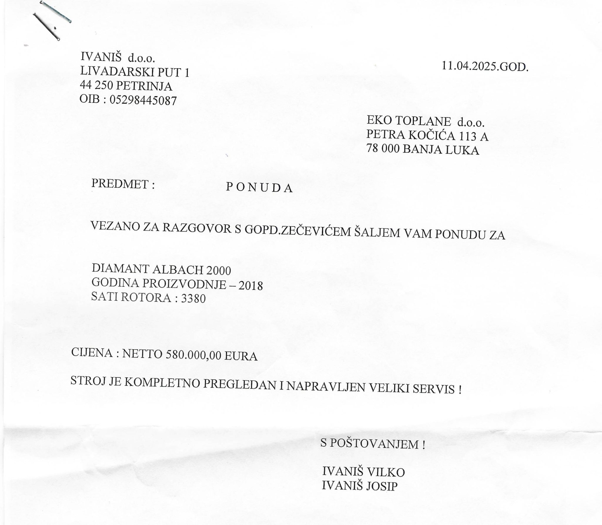 Prva ponuda navodno je dostavljena od strane firme „Ivaniš“ iz Petrinje u Hrvatskoj.