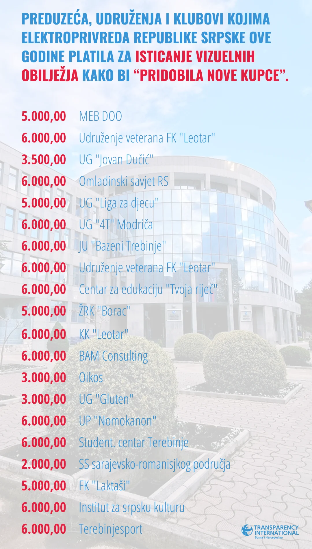 Transparency International u BIH (TI BiH) podnio je Agenciji za javne nabavke BiH zahtjev za monitoring ovih postupaka zbog sumnje da se nedozvoljenim dijeljenjem nabavki na po 6000KM, izbjegava primjena transparentnijeg postupka gdje bi i drugi pružaoci ovih usluga mogli da konkurišu.