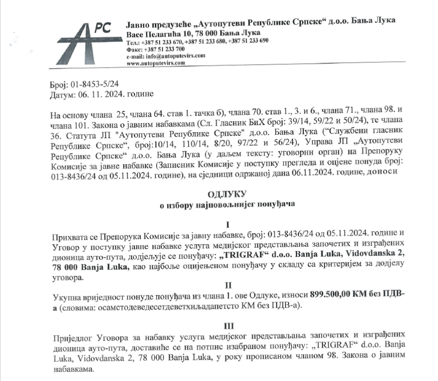 „Autoputevi RS“ su dodijelili malo poznatoj firmi „Trigraf“ iz Banjaluke posao medijskog predstavljanja onoga što je jedini posao ovog javnog preduzeća, tačnije promocije započetih i izgrađenih dionica auto-puta vrijedan više od million KM.