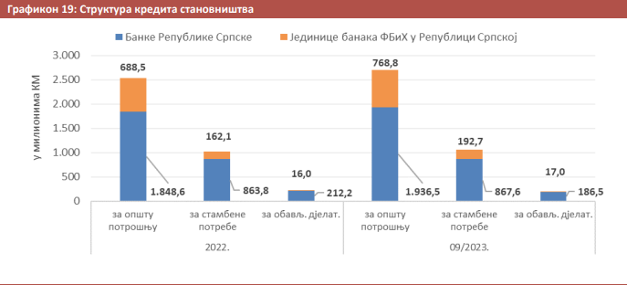 – Ukupni krediti stanovništvu za opštu potrošnju iznose 2,7 milijardi КM i veći su za 168,1 milion КM ili sedam odsto u odnosu na kraj 2022. godine – navodi se u devetomjesečnom izvještaju Agencije.