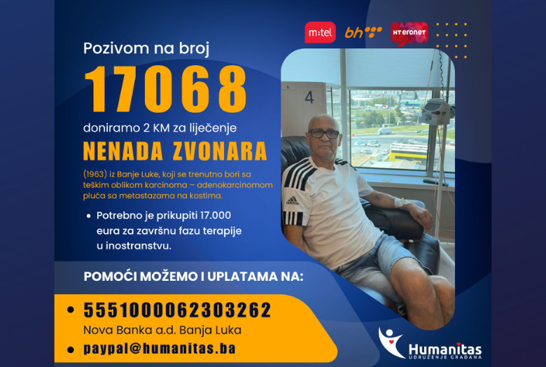 Humanitas pokreće donatorsku akciju za liječenje Nenada Zvonara (1963) iz Banje Luke, koji se trenutno bori sa teškim oblikom karcinoma – adenokarcinomom pluća sa metastazama na kostima.