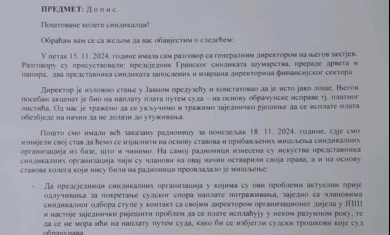 „Preovladalo mišljenje da predsjednici sindikalnih organizacija prije eventualnog podnošenja tužbe stupe u kontakt sa direktorima svojih šumskih gazdinstava i nastoje zajednički riješiti problem da se plate isplaćuju u nekom razumnom roku, te da se ne mora ići na naplatu putem suda, kako bi se izbjegli sudski troškovi koje sud obračunava“, navodi se u dopisu od 20. novembra i pozivaju sindikalne organizacije da u narednih sedam dana o svemu obavijeste JUSO.