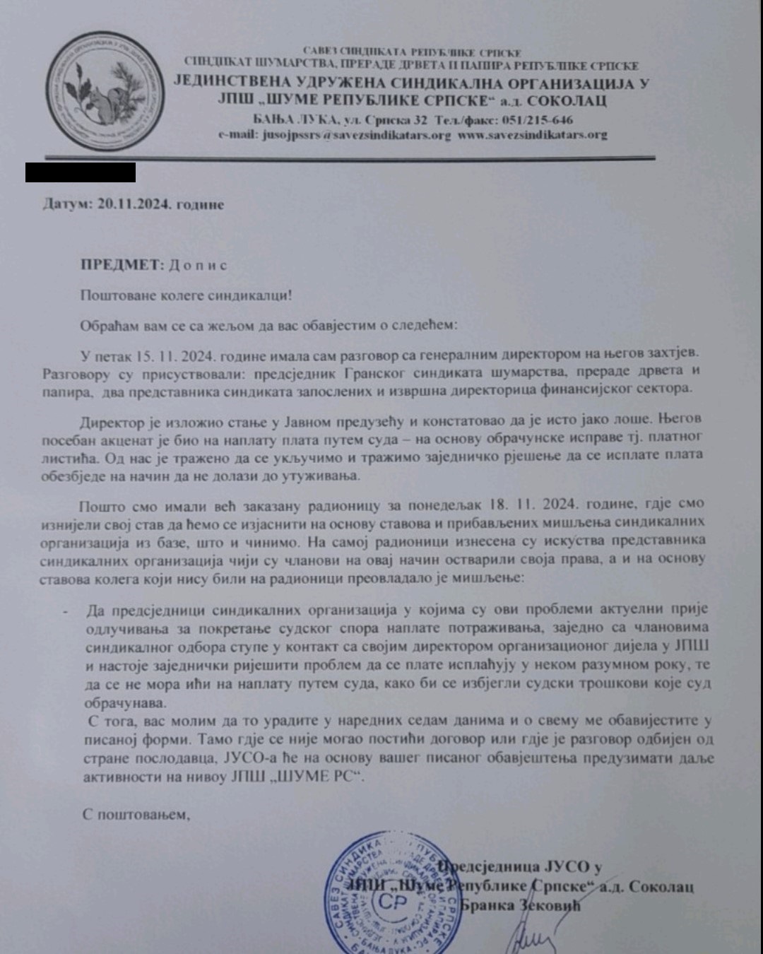 U dopisu koji je potpisala predsjednica JUSO Branka Zeković navodi se da je zajedno sa predsjednikom Granskog sindikata šumarstva razgovarala sa generalnim direktorom „Šuma RS“ Blaškom Kaurinom koji je, kako kaže, „na sastanku izložio stanje u preduzeću i konstatovao da je jako loše“.
