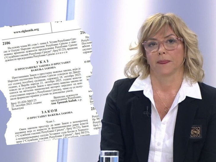 "Proglašavam Zakon o prestanku važenja zakona, koje je Narodna skupština Republike Srpske usvojila na Dvadeset sedmoj posebnoj sjednici, održanoj 18. oktobra 2025. godine, a Vijeće naroda 21. oktobra 2025. godine konstatovalo da se usvojeni Zakon o prestanku važenja zakona ne odnosi na vitalni nacionalni interes nijednog od konstitutivnih naroda u Republici Srpskoj, čime su se ispunili formalno-pravni uslovi za donošenje ukaza", stoji u Službenom glasniku Republike Srpske uz potpis Ane Trišić Babić, vršioca dužnosti predsjednika Republike.