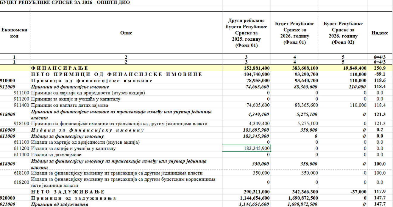 Prema drugom rebalansu budžeta, na stavci Izdaci za akcije i učešće u kapitalu su 183,3 miliona maraka, dok se prijedlogom budžeta za 2026. godinu o kome će danas raspravljati narodni poslanici na toj stavci nalazi – nula maraka.