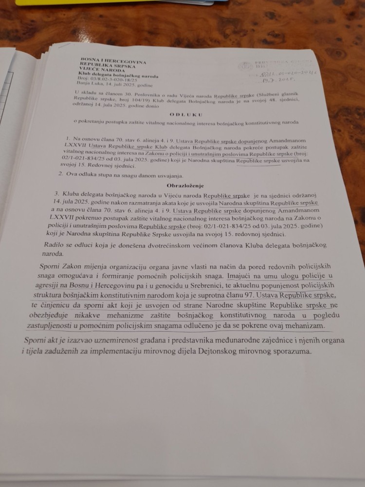 Delegati u Vijeću naroda Republike Srpske nisu podržali pokretanje postupka zaštite vitalnog nacionalnog interesa (veto) bošnjačkog naroda u vezi sa Zakonom o izmjeni i dopunama Zakona o policiji i unutrašnjim poslovima RS, a kojim se formira pomoćni sastav policije Republike Srpske, a jedan od razloga što ovo pitanje nije dobilo podršku leži u tome što je Klub Bošnjaka u predloženoj odluci, kod imena Republika Srpska, riječ Srpska pisao malim slovom.